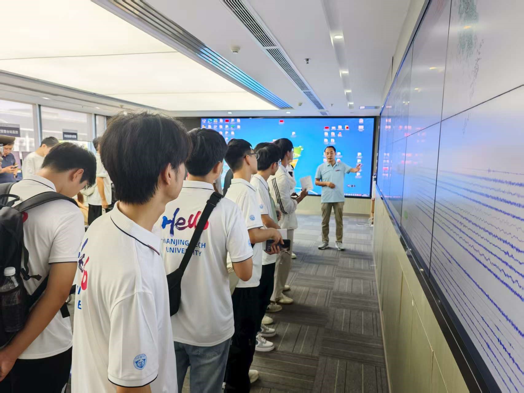 9月15日,师生们首先前往江苏省地震局、江苏地震科普馆及南京基准地震台进行了参观学习。江苏省地震台台长郑江蓉以及相关专家为学生们详细介绍了地震监测与预警的工作流程与技术手段,帮助同学们建立了对地震防灾前沿工作的直观认识。次日,实习队伍来到浦口区猪头山滑坡地质灾害自动监测示范点开展现场教学。该示范点是南京市典型的滑坡地质灾害智能监测预警工程。带队教师围绕该滑坡的孕育特征、失稳机理、监测预警系统构建及治理措施等内容,为同学们进行了系统讲解,深化了大家对地质灾害防治实际应用的了解。当日下午,师生们线上参加了在兰州地震研究所举行的防灾减灾专家报告会,听取了甘肃省地震局局长石玉成研究员、兰州地震研究所王兰民研究员、麻晓婧高级工程师所做的“城市防灾减灾面临的挑战与对策”、“2023年积石山6.2级地震和1920年海源8.5级地震”和“防震减灾法治建设”精彩报告。