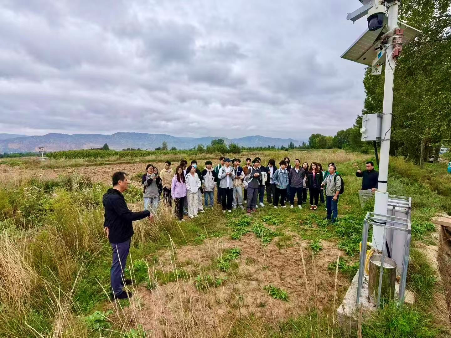 次日,师生一行前往青海省民和县中川乡金田村和草滩村,实地考察了积石山6.2级地震诱发的黄土液化泥流灾害,参观了我院吴志坚教授团队依托国家自然科学基金重点项目在该滑坡现场建设的滑坡监测预警示范场,严武建副研究员向同学们详细介绍了滑坡监测要素、方法、数据采集和传输手段,并从坡度、岩性、降水、地层产状和断裂等方面为大家解说了此次滑坡灾害的成因与治理情况。