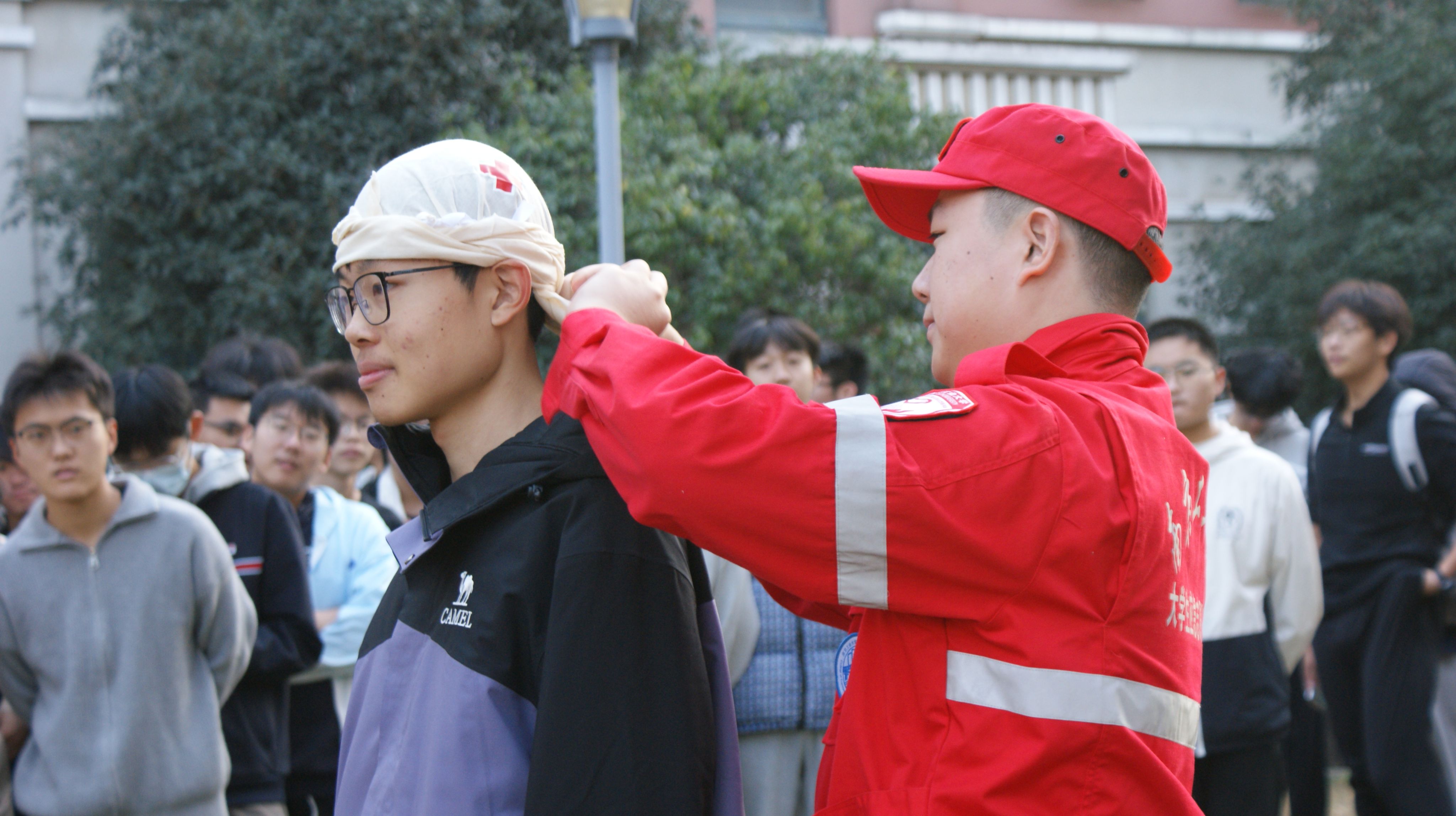 16:00,定点人员点燃消防演练烟雾,模拟火灾现场,无人机通过语音喊话形式提醒人员沿正确路径前往避难地点。同学们在应急志愿服务队队员的指引下,用湿毛巾捂住口鼻,低头弯腰有序进行逃生。撤离到安全区域后,空投无人机携应急救援物资前往指定地点投放急救包,应急志愿服务队队员利用急救包对“受伤人员”进行止血、包扎等急救操作,演示应急救援流程。校保卫处刘世伟老师对现场同学的表现给予充分肯定,并详细讲解应急疏散注意事项。在有奖问答环节,刘老师普及消防安全知识,现场气氛热烈,师生们纷纷表示受益匪浅。问答环节结束后,刘世伟老师亲自示范灭火器正确使用步骤,并组织在场同学逐一上前实操体验。
