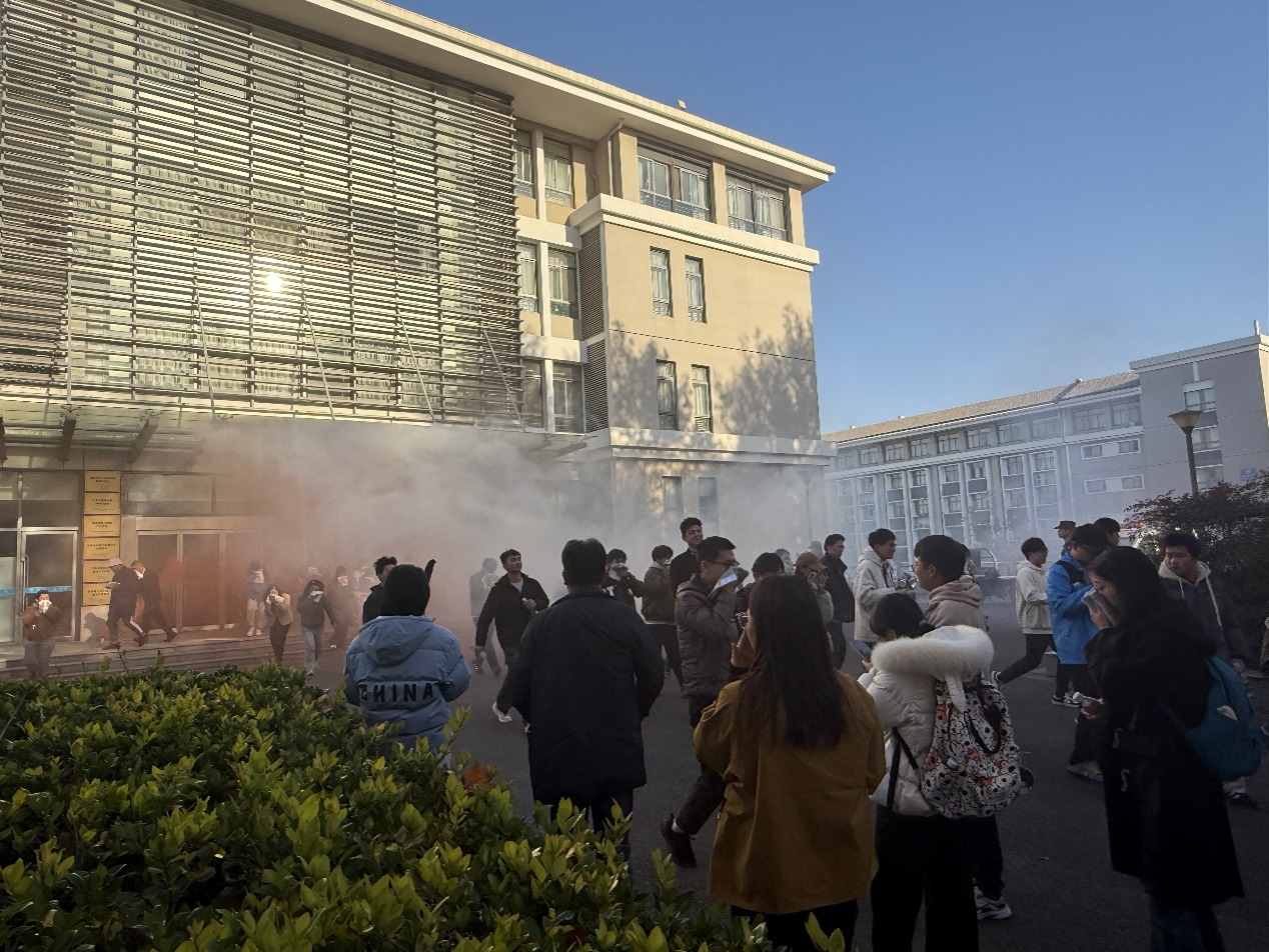 会议期间,杨会峰副院长介绍了活动背景及学院安全工作汇报,刘世伟科长和李强科长分别以《六院联合安全教育》和《实验室安全教育培训》为题做了邀请报告。活动第二阶段的消防演练由刘世伟科长指挥,模拟火灾现场,随着火灾自动报警系统启动,六院师生代表在滚滚浓烟中迅速有序疏散,完成消防逃生实战演习。疏散演练结束后,消防救援人员在立德楼前空旷区域设置了消防技能培训点。培训前开展了一场别开生面的消防知识趣味问答,激发了参与者的热情,现场气氛活跃。实操环节涵盖了消防防毒面具的正确佩戴、消防水带、灭火毯及灭火器的规范使用,进一步提升了应急处置能力。