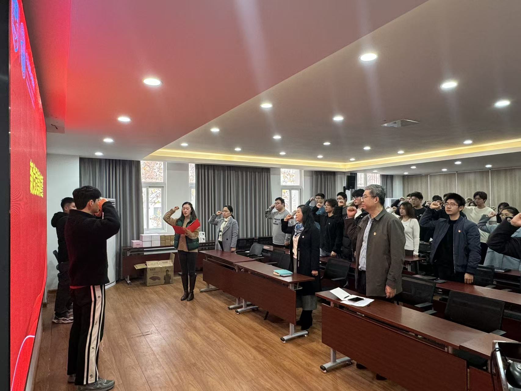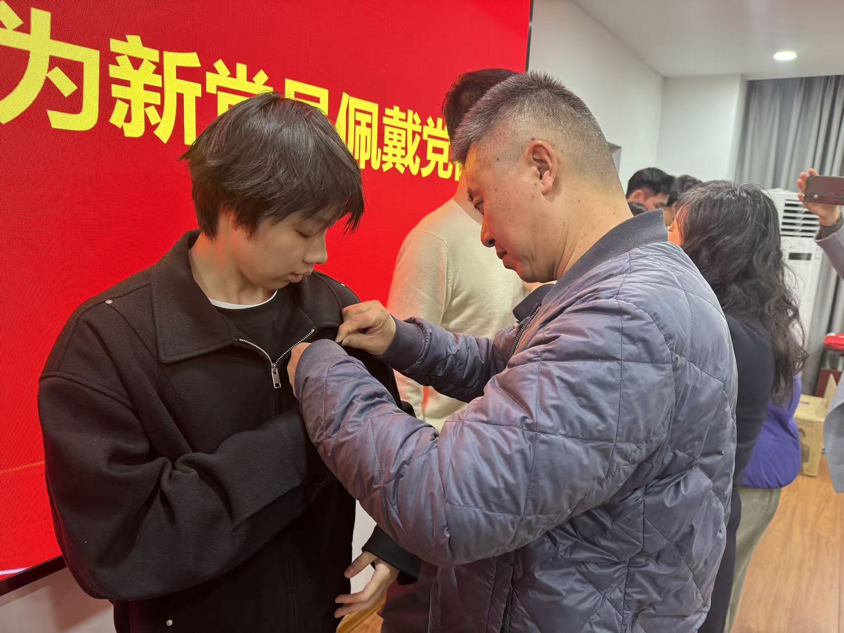 学院党委委员和支部书记们逐一为新发展的党员同志佩戴党员徽章,象征着他们正式成为党的一员,肩负起光荣的使命。在硕士研究生第四党支部张悦老师的带领下,新发展的党员们面向党旗庄严宣誓,铿锵誓言表达了为共产主义事业奋斗终身的坚定信念。