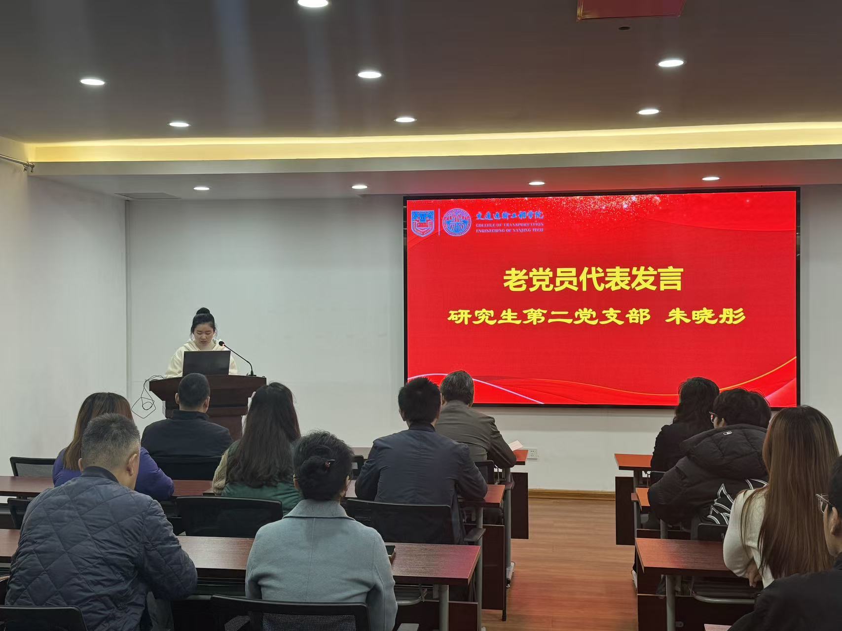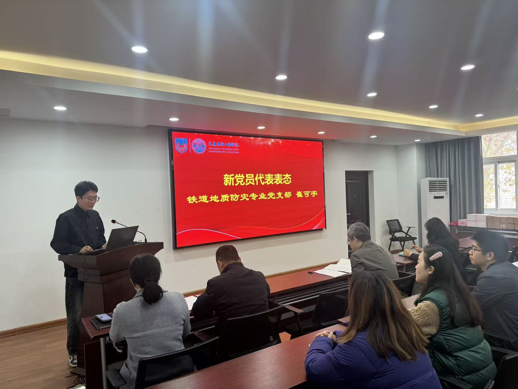 老党员代表、研究生第二党支部朱晓彤同志发言,分享入党初心与成长感悟。新党员代表、铁道地质防灾专业党支部崔可宇同志表态,将以实际行动践行誓言,争做合格党员。院长周峰声情并茂地讲述了宰教授生前事迹,希望大家学习宰教授艰苦拼搏的治学态度、尊师重教的生活作风,精益求精的科研精神,激励师生见贤思齐、奋发有为。