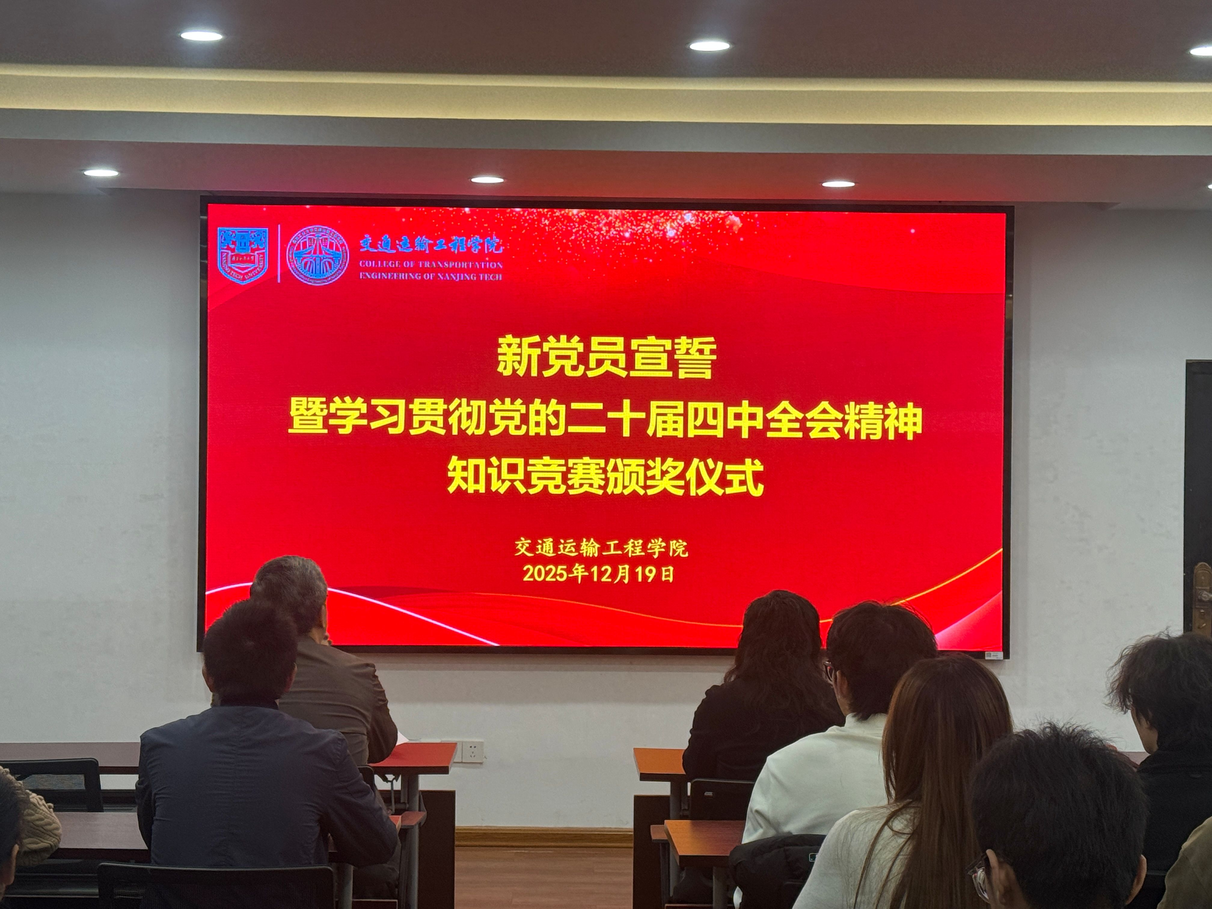 2025年12月19日,交通运输工程学院在庄严而热烈的氛围中,成功举办新党员宣誓仪式暨学习贯彻党的二十届四中全会精神知识竞赛颁奖仪式。学院党委委员、师生党员代表共同参与本次活动。活动由学院党委副书记刘全振主持。